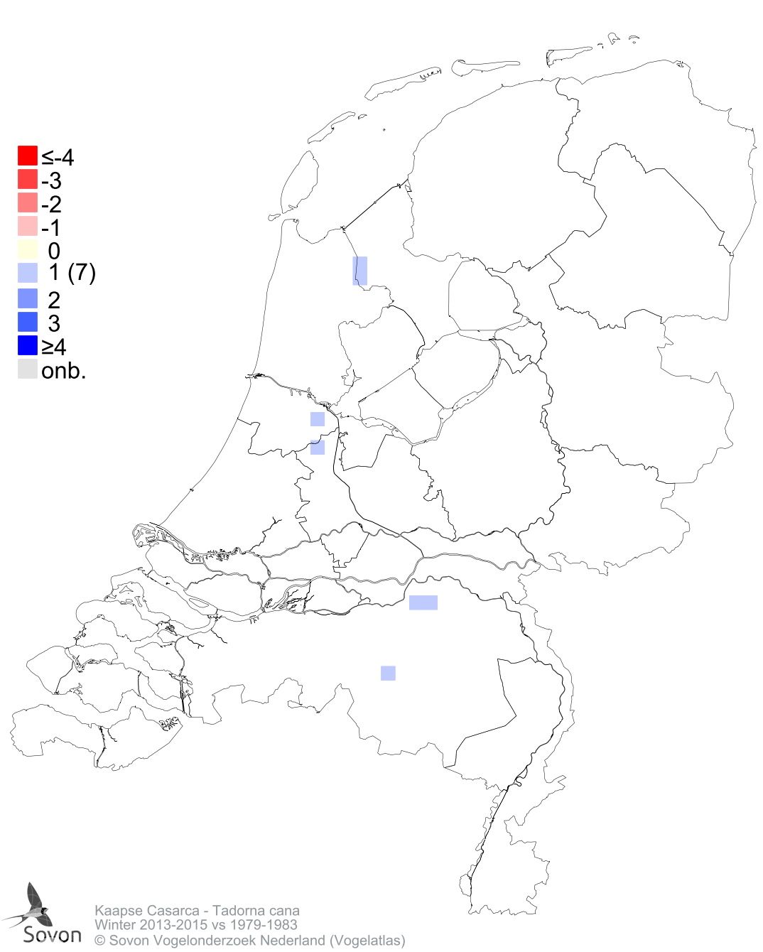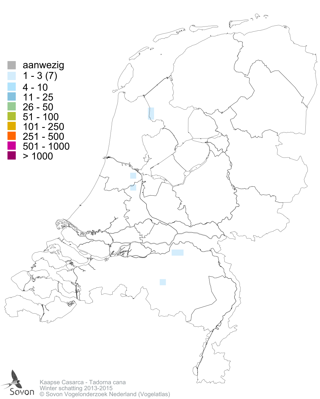 Kaapse Casarca Wetenschappelijke naam Tadorna cana English name South African Shelduck Broedparen 2013-2015 0 Winteraantallen 2013-2015 1-5 Aantallen Kies Winter schatting 2013-2015 Winter schatting 2013-2015 aantal per atlasblok o.b.v. alle beschikbare dataKies Winter schatting 2013-2015 Presentie Kies Winter aanwezigheid 2013-2015 Winter aanwezigheid 1979-1983 Winter aanwezigheid 2013-2015 aanwezigheid per atlasblokKies Winter aanwezigheid 2013-2015 Winter aanwezigheid 1979-1983 Veranderingen Kies Winter 2013-2015 vs 1979-1983 Winter pres 2013-2015 vs 1979-1983 Winter 2013-2015 vs 1979-1983 N klassen verschil o.b.v. schattingen in beide periodesKies Winter 2013-2015 vs 1979-1983 Winter pres 2013-2015 vs 1979-1983 Combinatie Kies Winter schatting 2013-2015 Winter aanwezigheid 2013-2015 Winter aanwezigheid 1979-1983 Winter 2013-2015 vs 1979-1983 Winter pres 2013-2015 vs 1979-1983 Winter schatting 2013-2015 aantal per atlasblok o.b.v. alle beschikbare dataKies Winter schatting 2013-2015 Winter aanwezigheid 2013-2015 Winter aanwezigheid 1979-1983 Winter 2013-2015 vs 1979-1983 Winter pres 2013-2015 vs 1979-1983