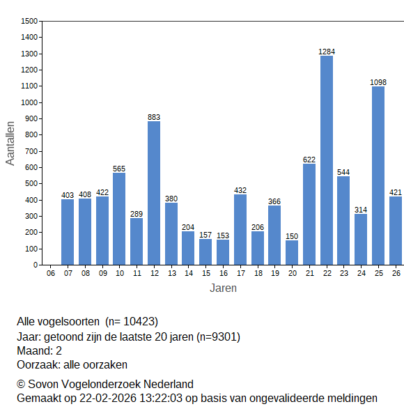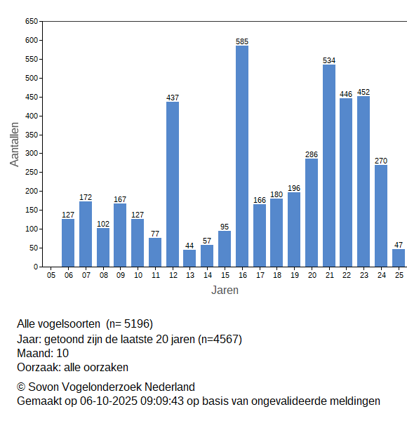 Op deze pagina zie je de aantallen dode vogels die gemeld zijn via de dode vogel invoer. Alle meldingen (incl. ongevalideerde) zijn daarin opgenomen.