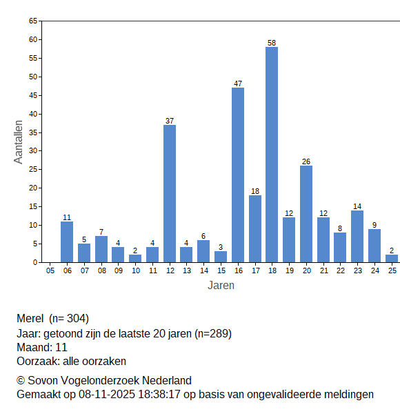 Op deze pagina zie je de aantallen dode vogels die gemeld zijn via de dode vogel invoer. Alle meldingen (incl. ongevalideerde) zijn daarin opgenomen.