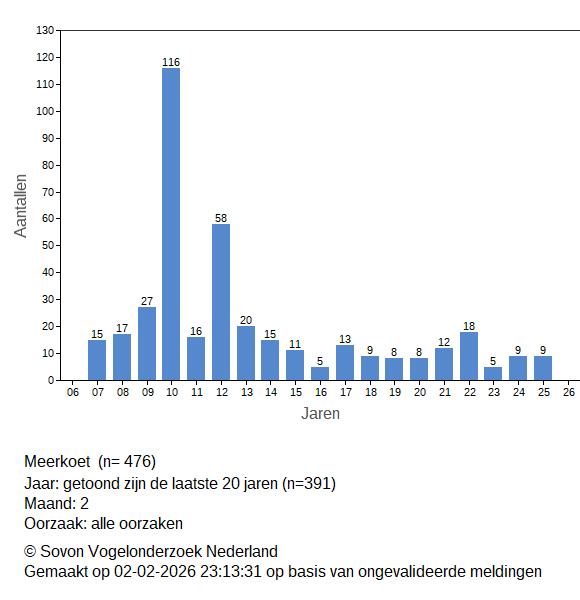 Op deze pagina zie je de aantallen dode vogels die gemeld zijn via de dode vogel invoer. Alle meldingen (incl. ongevalideerde) zijn daarin opgenomen.