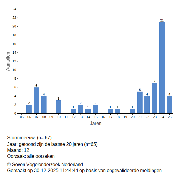 Op deze pagina zie je de aantallen dode vogels die gemeld zijn via de dode vogel invoer. Alle meldingen (incl. ongevalideerde) zijn daarin opgenomen.
