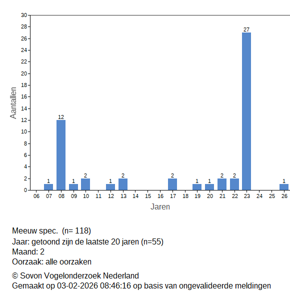 Op deze pagina zie je de aantallen dode vogels die gemeld zijn via de dode vogel invoer. Alle meldingen (incl. ongevalideerde) zijn daarin opgenomen.